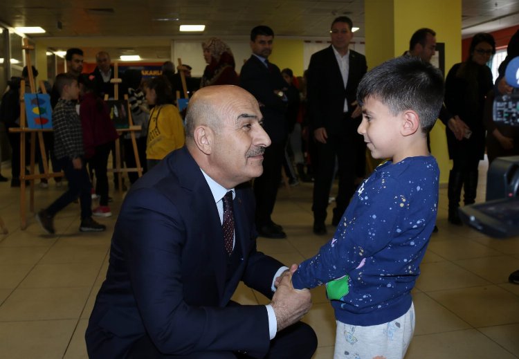 Vali Mahmut Demirtaş, serginin açılışını yaparak depremzede çocukların hünerlerini sergilediği resimleri tek tek inceleyip onları tebrik etti.