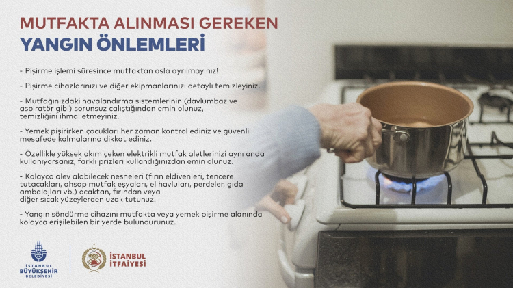 Zaman zaman vatandaşlara uyarılarda bulunan İstanbul Büyükşehir Belediyesi bünyesindeki İstanbul İtfaiyesi, mutfakta alınması gereken yangın önlemlerine karşı uyarıcı bir paylaşımda bulundu.