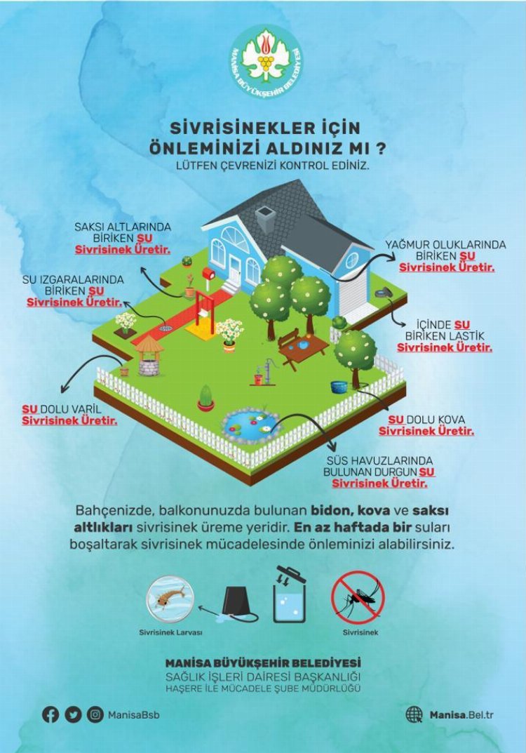 Sivrisineklerin yumurtalarını suya bıraktıklarını ve tüm gelişim evrelerini su içerisinde tamamladıktan sonra ergin hale gelerek uçmaya başladıklarını anlatan Büyükşehir heyeti, vatandaşların evinin balkonunda, bahçesinde bulunan kova, bidon, saksı altlığı, kullanılmayan araba lastikleri, su kapları vb. alanlarda su biriktirmemelerini veya suları haftada bir boşaltarak mücadeleye destek vermeleri gerektiğini aktardı.