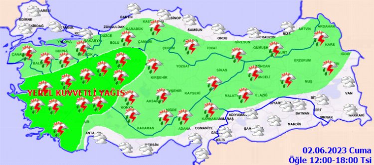 KUVVETLİ YAĞIŞ UYARISI: Gök gürültülü sağanak yağışların, Ege, İç Anadolu’nun kuzeybatısı, Kocaeli, Sakarya, Bilecik, Burdur ve Isparta çevreleri, Antalya’nın batı kesimleri ile Bursa’nın doğu ilçelerinde yerel kuvvetli olması (21-50 kg/m2) olması beklendiğinden sel, su baskını, yıldırım, yerel dolu yağışı ve yağış anında kuvvetli rüzgar gibi olumsuzluklara karşı dikkatli ve tedbirli olunması gerekmektedir.