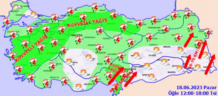 KUVVETLİ YAĞIŞ UYARISI: Yağışların: Marmara’nın güney ve doğusu, Ege, Göller Yöresi, İç Anadolu’nun kuzeybatısı, Batı ve Orta Karadeniz’in iç kesimleri, Kahramanmaraş, Osmaniye, Hatay ve Samsun çevreleri, Gaziantep’in batısı, Antalya’nın kuzeybatısı ile Adana’nın kuzey ve doğu kesimlerinde yerel olmak üzere kuvvetli olması beklendiğinden ani sel, yerel su baskını, yıldırım, yerel dolu yağışı ve yağış anında kuvvetli rüzgar gibi olumsuzluklara karşı dikkatli ve tedbirli olunması gerekmektedir.