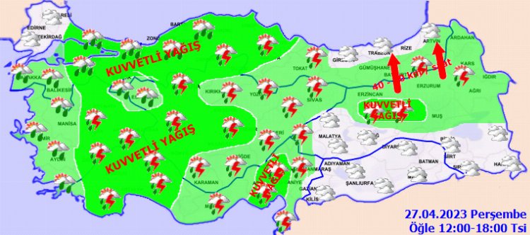 KUVVETLİ YAĞIŞ UYARISI: Yağışların Marmara’nın doğusu, İç Ege, Batı Akdeniz, İç Anadolu’nun batısı, Batı Karadeniz, Orta Karadeniz’in batısı ile Kırşehir, Nevşehir, Adana, Tunceli ve Bingöl çevrelerinde yerel kuvvetli olması beklendiğinden sel, su baskını, yıldırım, yerel dolu yağışı ve kuvvetli rüzgâr gibi olumsuzluklara karşı dikkatli ve tedbirli olunması gerekmektedir.
