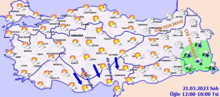 RÜZGAR: Genellikle kuzeyli, yurdun kuzey kıyılarında doğu ve güneydoğu yönlerden hafif, ara sıra orta kuvvette, Doğu Akdeniz’in iç kesimleri ve İç Anadolu’nun güneydoğusunda kuzeyli yönlerden kuvvetli (40-60 km/saat) esmesi bekleniyor.