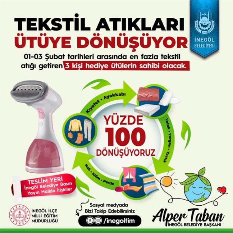 Bursa’da İnegöl Belediyesi, tekstil atıklarının geri dönüşüme kazandırılması ve bu konuda farkındalık oluşturulması adına bir kampanya düzenledi. “Tekstil atıkları ütüye dönüşüyor” sloganıyla yapılan kampanya kapsamında en fazla tekstil atığı getiren 3 kişiye ütü hediye edilecek.