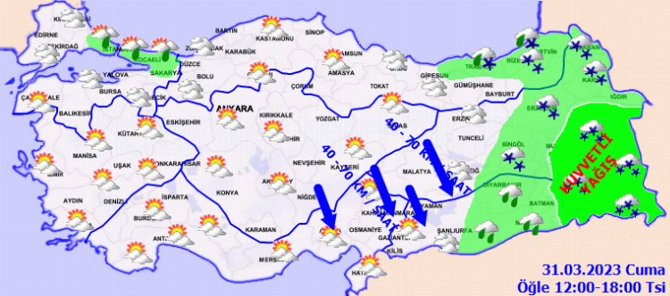 RÜZGAR: Genellikle kuzey ve kuzeybatı, Doğu Akdeniz’in iç kesimleri İç Anadolu’nun güneydoğusu, Doğu ve Güneydoğu Anadolu’nun batısında kuzey ve kuzeybatı yönlerden kuvvetli ve yer yer fırtına şeklinde (50-70 km/saat) esmesi bekleniyor.