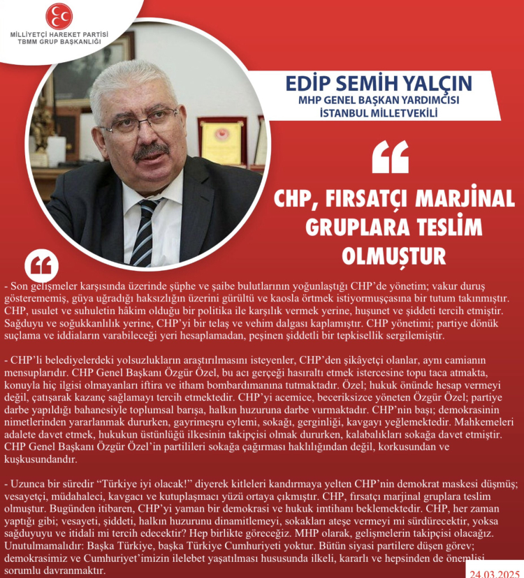 MHP Genel Başkan Yardımcısı ve İstanbul Milletvekili Edip Semih Yalçın, CHP’nin fırsatçı marjinal gruplara teslim olduğunu iddia ederken, CHP Genel Başkanı Özgür Özel’in partilileri sokağa çağırmasının haklılığından değil, korkusundan ve kuşkusundan olduğunu öne sürdü. Yalçın, “CHP, İstanbul halkının huzuruna kan ve şiddet doğradı” dedi.
