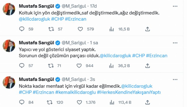 Sarıgül, CHP Genel Başkanı Kemal Kılıçdaroğlu’nu etiketleyerek yaptığı paylaşımlarında, “Nokta kadar menfaat için virgül kadar eğilmedik”, “Yapıcı ve yol gösterici siyaset yaptık. Sorunun değil çözümün parçası olduk”, “Koltuk için yön değiştirmedik, saf değiştirmedik, ağız değiştirmedik” ifadelerini kullandı.