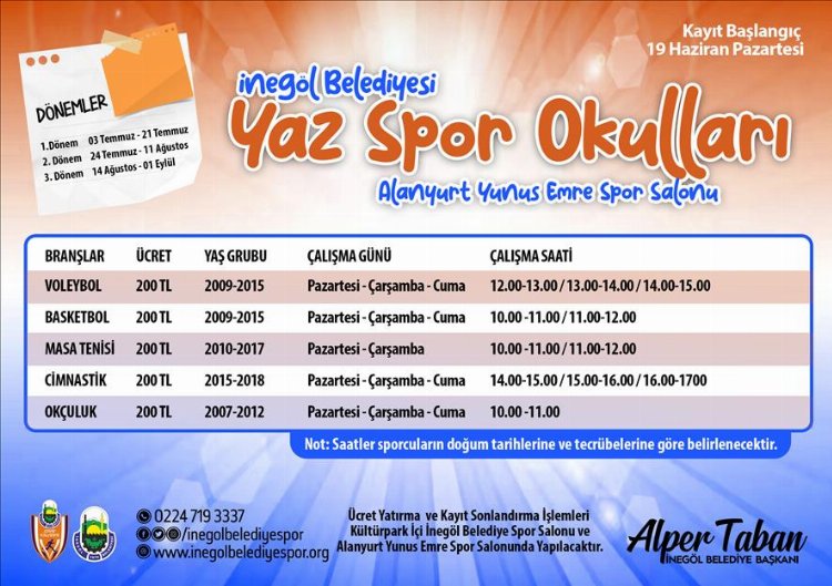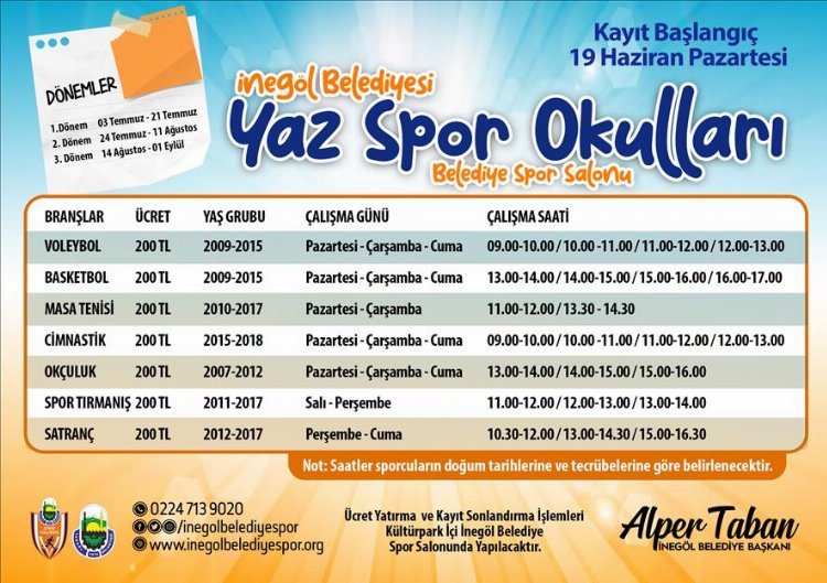 Öğrencilerin keyifli, eğlenceli ve fiziksel gelişimleri açısından verimli bir dönem geçirmelerini sağlamak amacıyla İnegöl Belediye Spor Kulübü bünyesinde 3 dönem şeklinde yapılacak yaz spor okulları için kayıtlar 19 Haziran Pazartesi günü itibariyle alınmaya başlayacak.