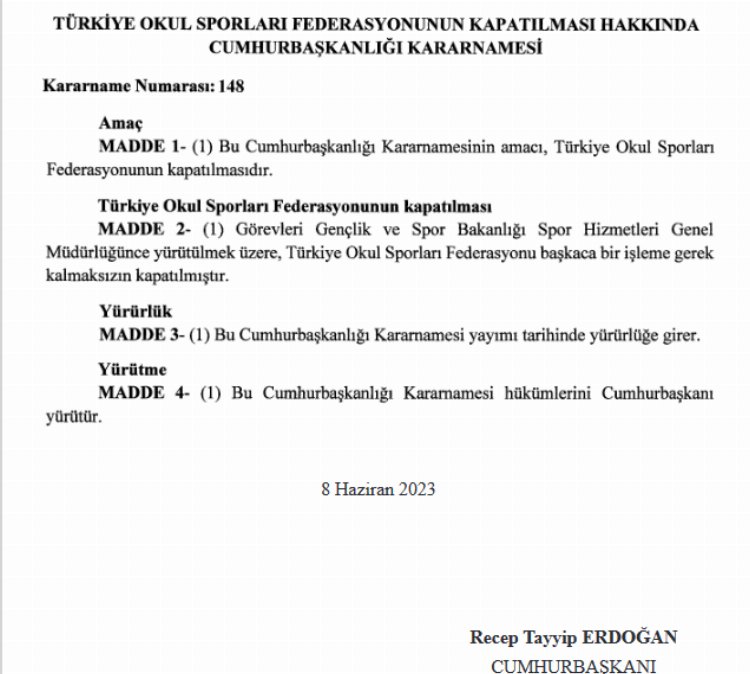 Cumhurbaşkanı Recep Tayyip Erdoğan imzasıyla yayımlanan kararname ile bugünkü Resmi Gazete’de yayımlanan karara göre,  Gençlik ve Spor Bakanlığı Spor Hizmetleir Genel Müdürlüğü’nce yürütülmek üzere, Türkiye Okul Sporları Federasyonu başkaca bir işleme gerek kalmaksızın kapatıldı.