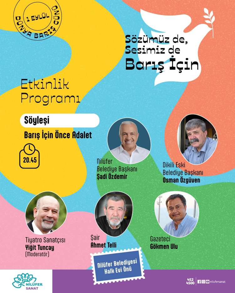 Bursa’da Nilüfer Belediyesi, 1 Eylül Dünya Barış Günü’nü, “Sözümüz de, sesimiz de barış için” sloganıyla Halk Evi önünde düzenleyeceği özel bir programla kutlayacak.